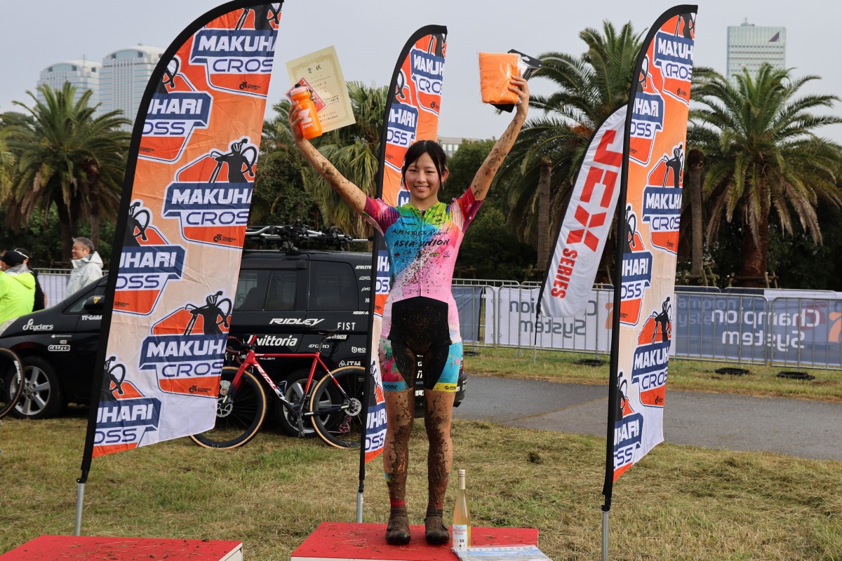 「泥のコースは結構好きなので、幕張でも優勝できて良かったです。日吉彩華ちゃんはテクニックがありますし、積極的な走りが持ち味の選手。彼女と競り合えたおかげで良いレースができました。今年はシクロクロスシーズンはレースを重ねるごとに調子が上がってきているので、全日本に向けてもっと調子を上げられたらなと思っています」と、石田は笑顔でコメントした。