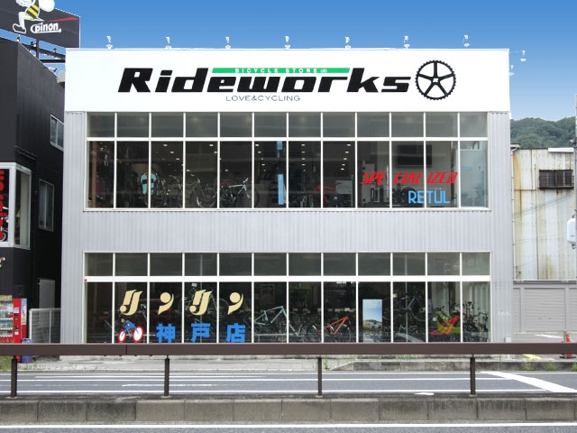 神戸市 東灘区 国道2号線沿い、四角い建物が目印の自転車専門店 Rideworks。一階は、電動自転車、子ども用自転車、クロスバイク、カジュアルバイクなど、通学・通勤、普段のお買い物などにお気軽に乗っていただける自転車。 二階にはスポーツ自転車本体や各種パーツ、シューズやヘルメット、サングラスなどを揃えております。