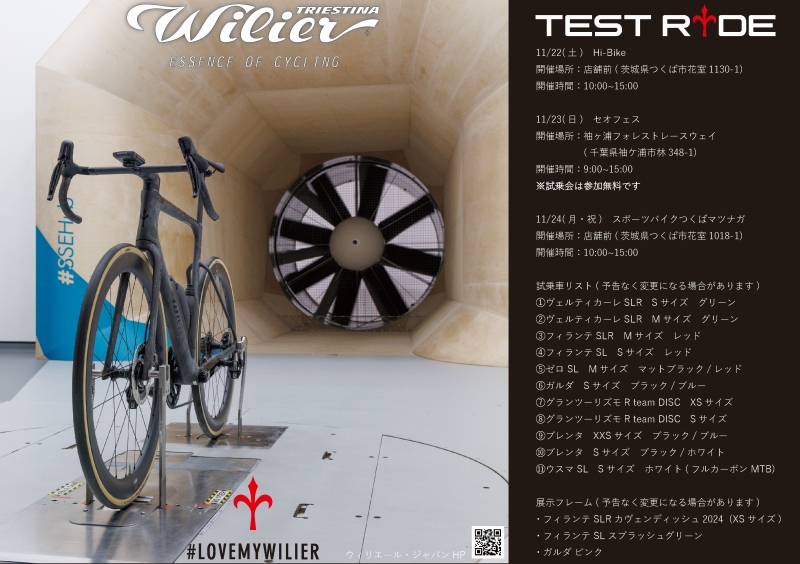 ウィリエールが11月22日(土)に茨城県つくば市の「Hi-Bike」で、23日(日)にセオフェスで、24日(月・祝)に茨城県つくば市の「スポーツバイクつくばマツナガ」で試乗会を開催する。Verticale SLRやFILANTE SLRなどの最新ラインアップを試乗できる機会だ。以下、プレスリリースより紹介しよう。
