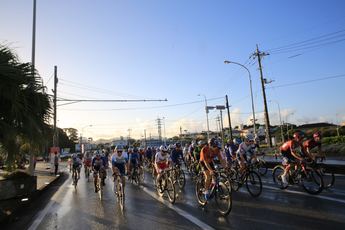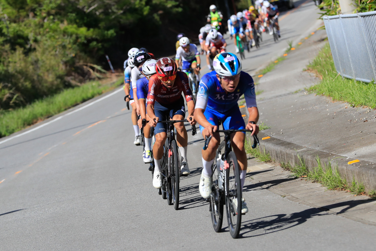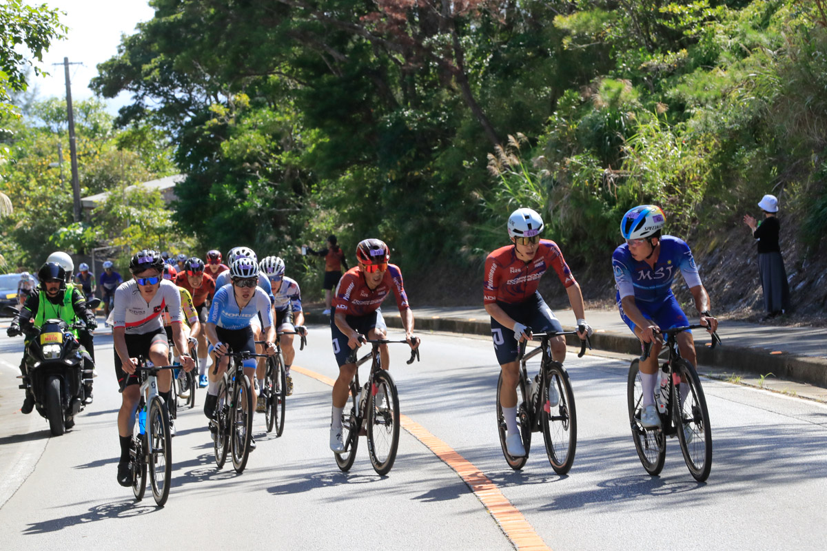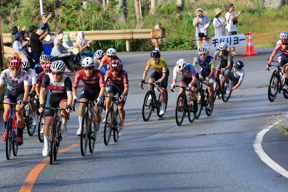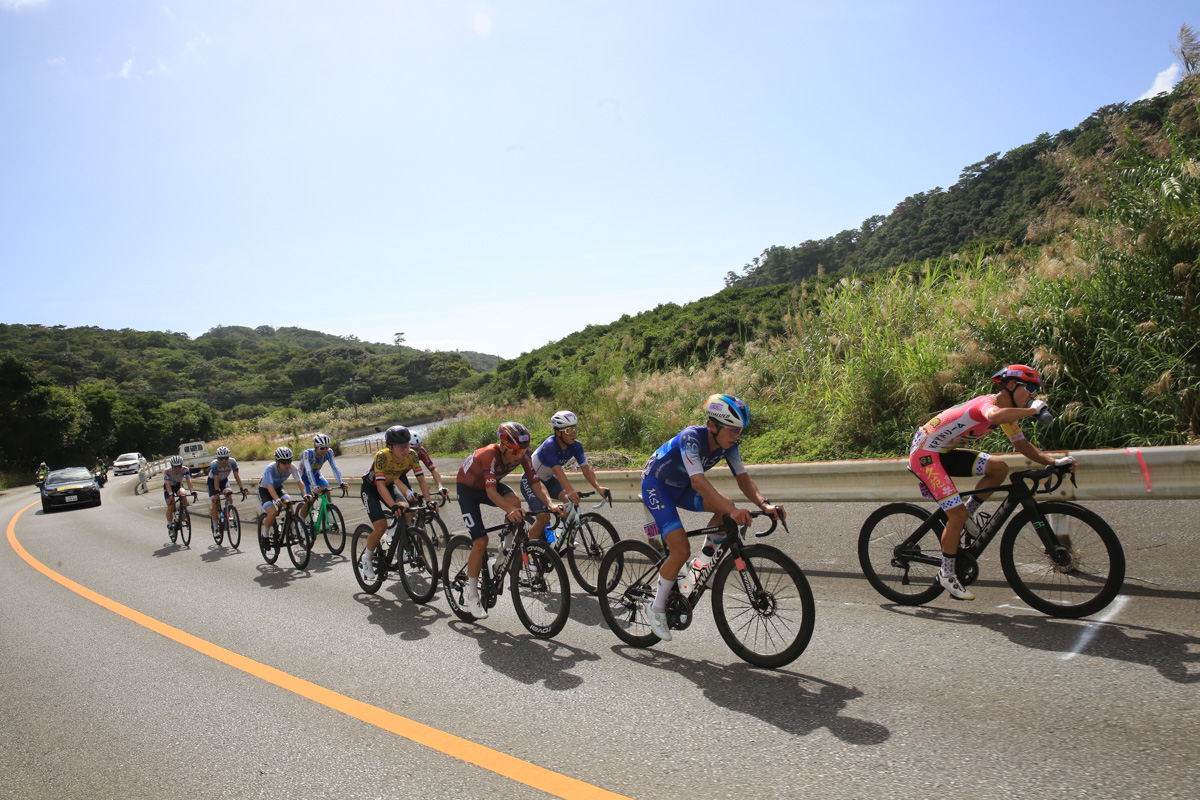 レースはあと3時間。ここから徐々に後半を意識した動きが始まる。2回目の与那の坂と、その後に控える学校坂を前でこなしたい選手たちがしきりにアタックし、遅くないペースで辺戸岬から西海岸を南下していく。