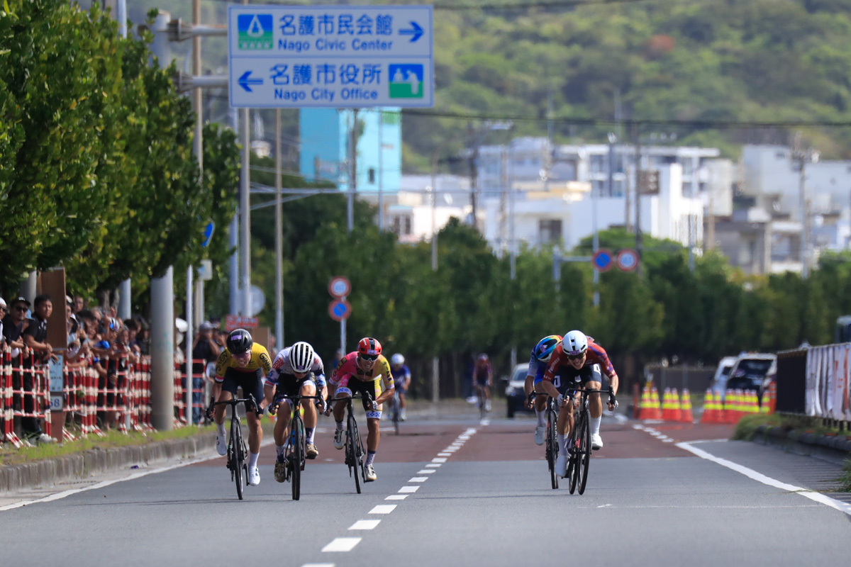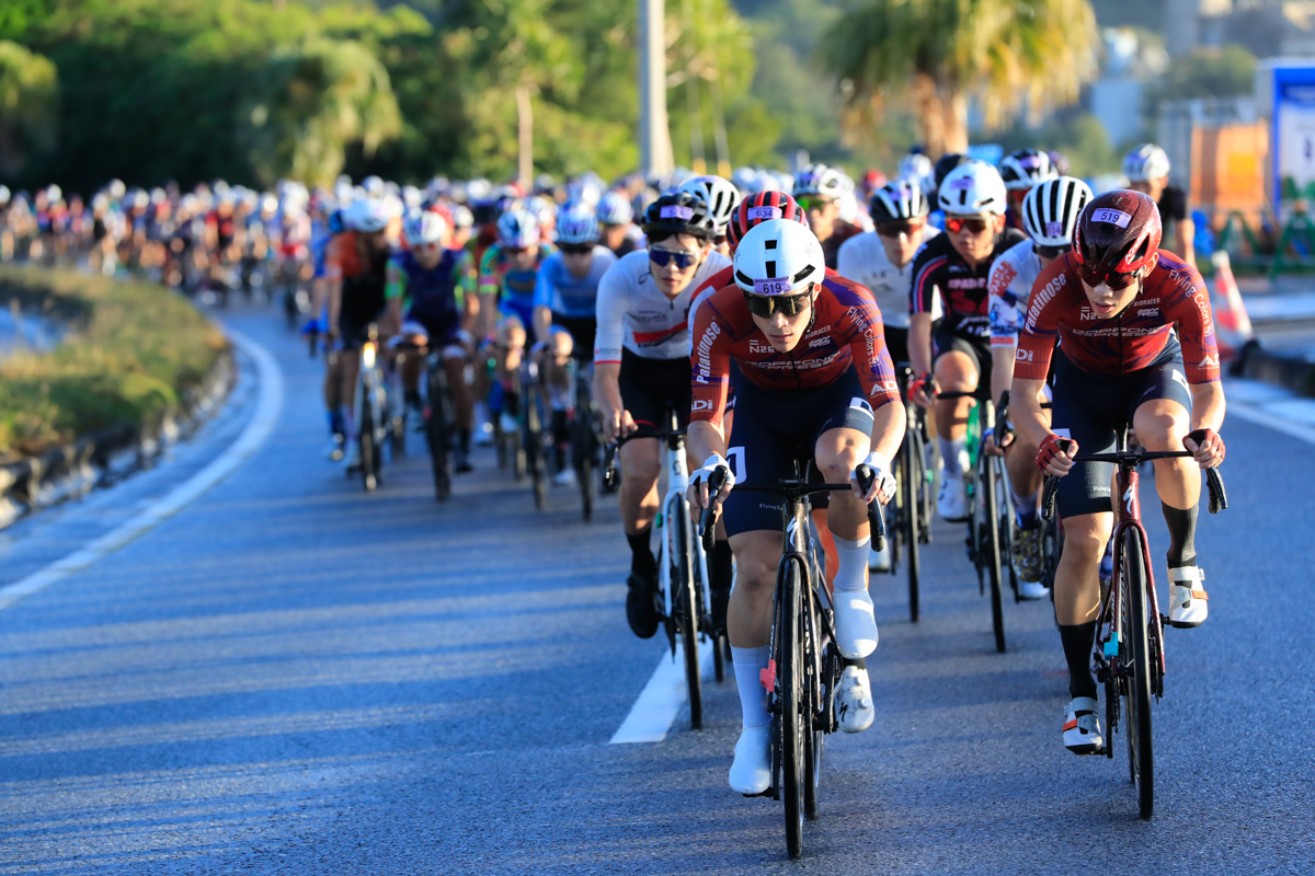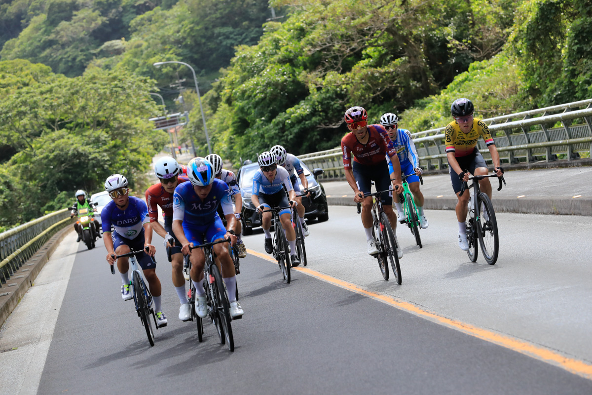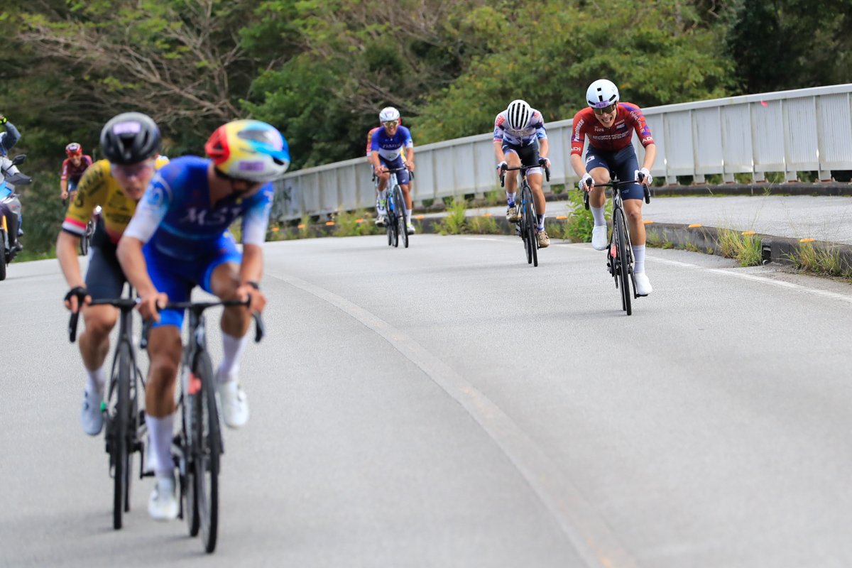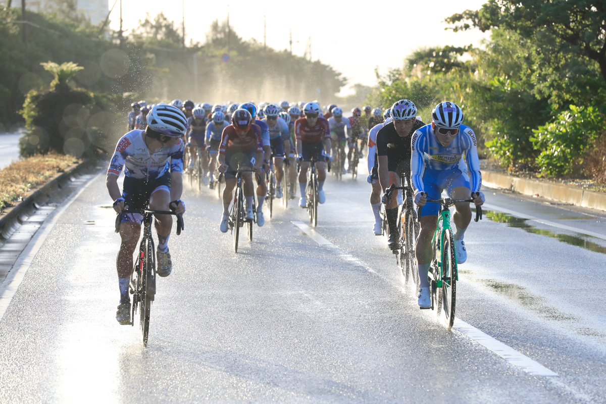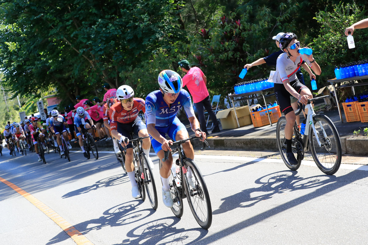 レースはあと3時間。ここから徐々に後半を意識した動きが始まる。2回目の与那の坂と、その後に控える学校坂を前でこなしたい選手たちがしきりにアタックし、遅くないペースで辺戸岬から西海岸を南下していく。