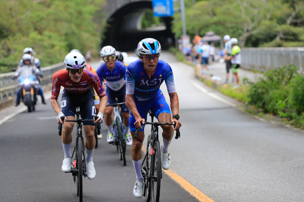 慶佐次の補給ポイントでペースを上げる井上亮(Magellan Systems Japan)、追走する大前翔 photo:Makoto AYANO