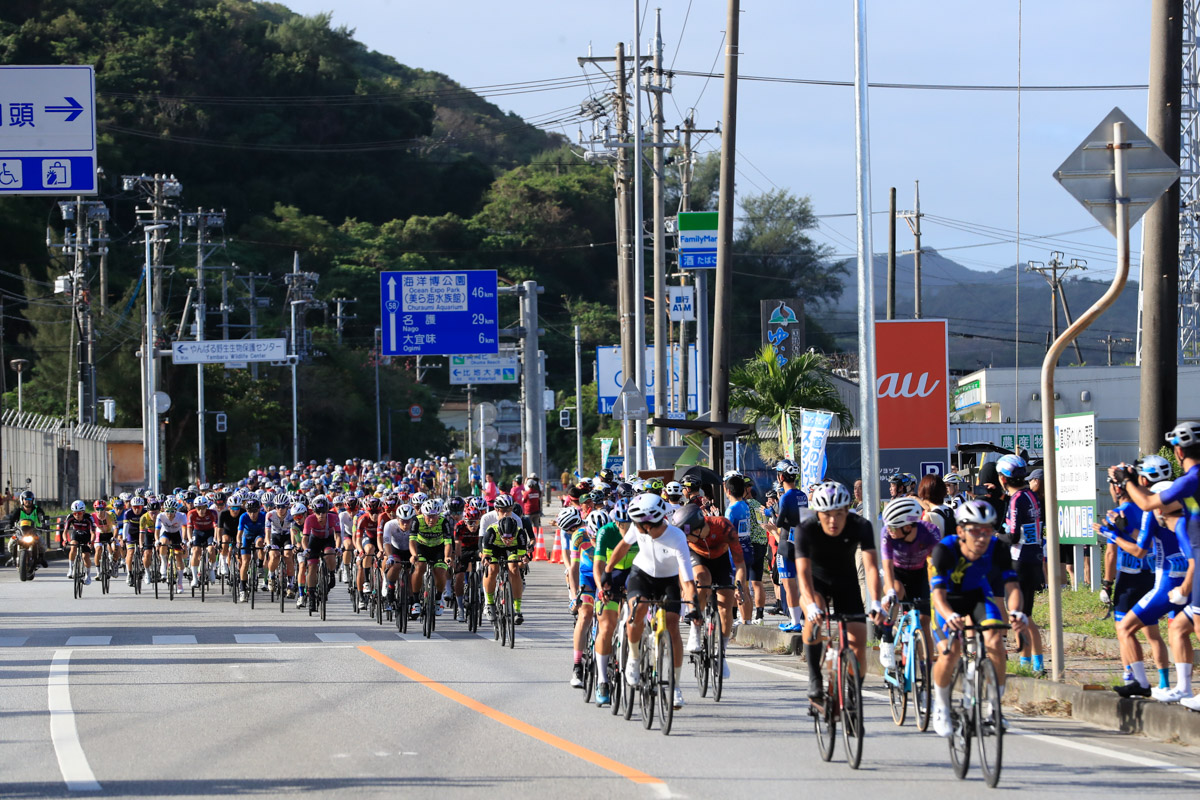 国頭村の道の駅前を通過する市民200kmのメイン集団 photo:Makoto AYANO