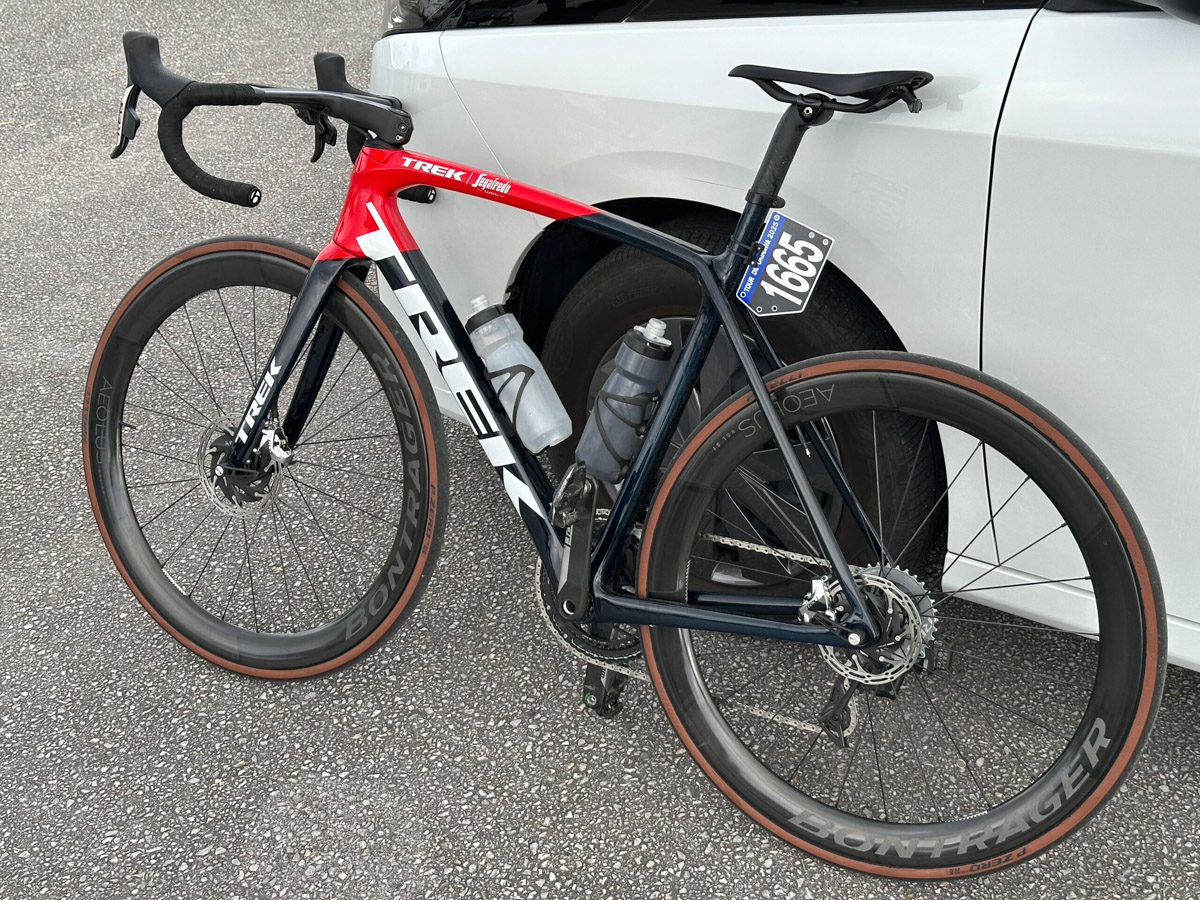 バイクはトレックÉmonda SLR 9 eTap AXSに、フロント54-41T、リア10-33T。以上はいつもと変わらないが、今回のレースでは新機材として次の2つを投入した。タイヤとTPUチューブだ。